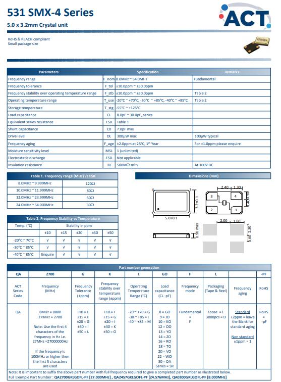 英國ACT晶振,531 SMX-4晶振,5032晶體諧振器