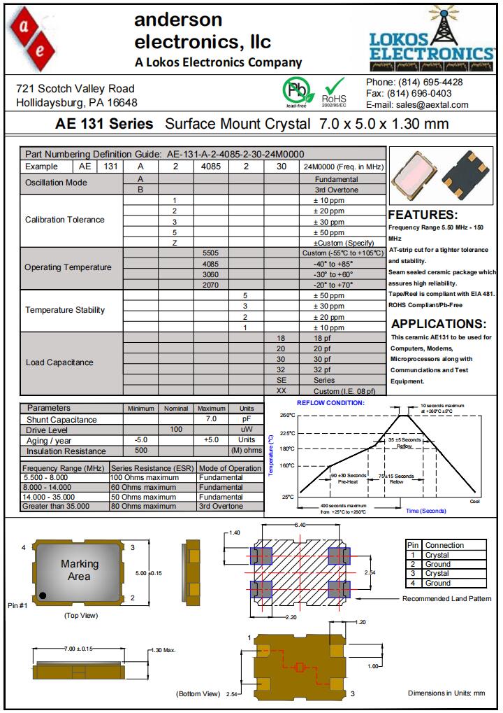 AE-131-A-2-4085-3-20-24M0000|Anderson Crystals,Anderson晶振,AE-131無源晶振,石英晶體諧振器,AE-131-A-2-4085-3-20-24M0000晶振,進口晶振,7050mm晶振,四腳貼片晶振,SMD晶振,頻率24MHz,負載20pF,工作溫度-40~85°C,頻率容差20pm,高穩定性晶振,無鉛環保晶振,低老化晶振,調制解調器晶振,微處理器晶振,計算機晶振,通信設備晶振.