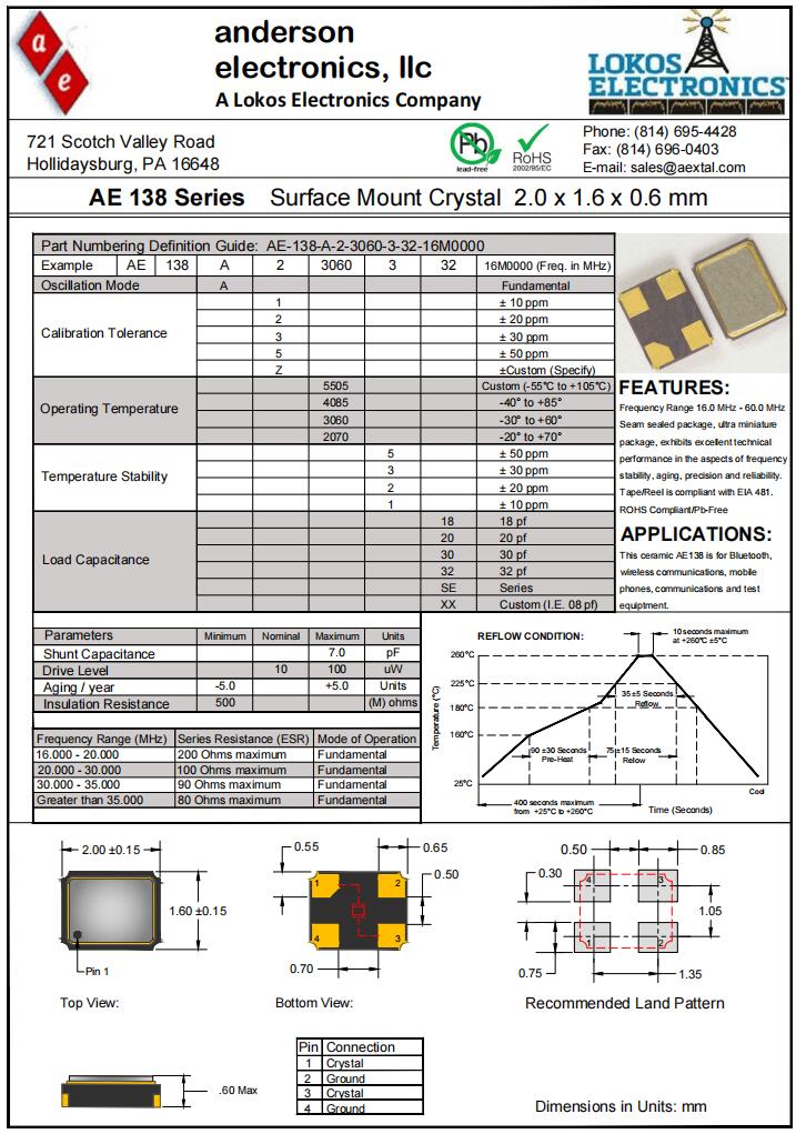 Anderson晶振|AE-138-A-2-5505-3-32-16M0000|2016超小型晶振,歐美進口晶振,Anderson晶振,AE138貼片晶振,無源晶振,AE-138-A-2-5505-3-32-16M0000晶振,石英晶體諧振器,四腳貼片晶振,2016mm晶振,SMD晶體,頻率16MHz,負載32pF,工作溫度-55~105°C,頻率容差20pm,超小型晶振,耐高溫晶振,無鉛環(huán)保晶振,無線通信晶振,測試與測量設備晶振,移動電話晶振,工業(yè)控制系統(tǒng)晶振.