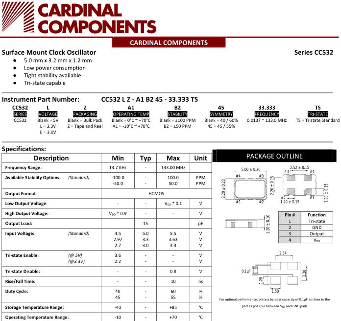 更多>>卡迪納爾晶振,CC532進(jìn)口時(shí)鐘振蕩器,CC532LZ-A1B245-20.000TS晶振