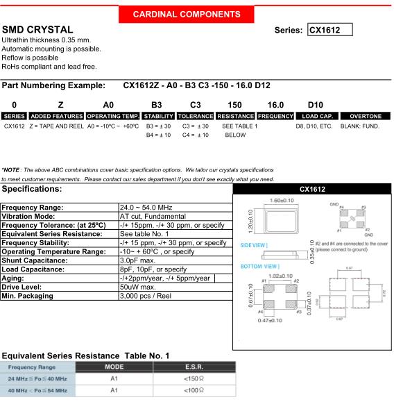 美國Cardinal貼片晶振,CX1612小體積晶振,CX1612Z-A0B4C4-150-16.0D12晶振,貼片晶振本身體積小,超薄型石英晶體振蕩器,特別適用于有目前高速發展的高端電子數碼產品,因為晶振本身小型化需求的市場領域,小型,薄型是對應陶瓷振蕩器(偏差大)和普通的石英晶體振蕩器(偏差小)的中間領域的一種性價比較出色的產品.產品廣泛用于筆記本電腦,無線電話,衛星導航SSD,USB,Blu-ray等用途,符合無鉛焊接的高溫回流焊曲線特性.