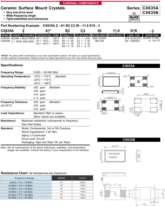 美國卡迪納爾晶振,CX635B兩腳晶振,CX635BZ-A2B3C350-11.0D16-3晶振,貼片晶振本身體積小,超薄型石英晶體振蕩器,特別適用于有目前高速發展的高端電子數碼產品,因為晶振本身小型化需求的市場領域,小型,薄型是對應陶瓷振蕩器(偏差大)和普通的石英晶體振蕩器(偏差小)的中間領域的一種性價比較出色的產品.產品廣泛用于筆記本電腦,無線電話,衛星導航SSD,USB,Blu-ray等用途,符合無鉛焊接的高溫回流焊曲線特性.