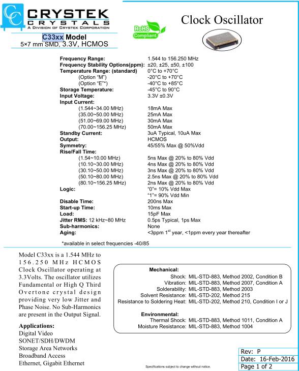 C33xx系列時鐘振蕩器,Crystek歐美晶體,C3392-20.000MHz晶振