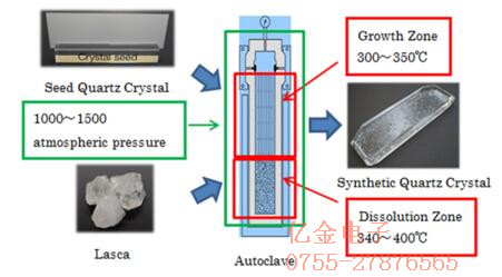 盡管石英確實以其晶體形式自然發(fā)生,但晶體不符合石英晶體諧振器所要求的質(zhì)量.因此,晶體需要在高度受控的條件下人工生長.合成晶體使用晶種在約350℃和非常高的壓力下生長約1000個大氣壓.這是在專門制造的晶體生長爐中完成的,大約需要45到90天.