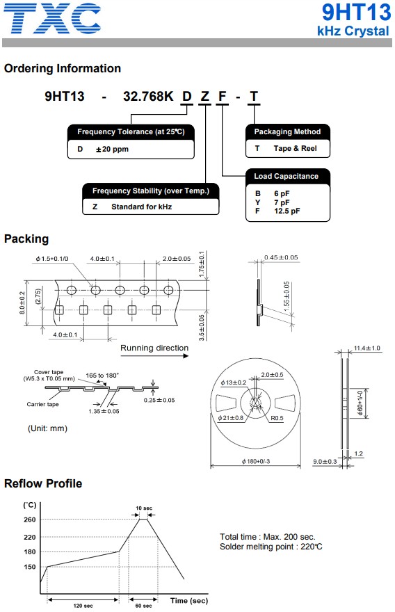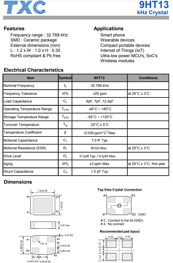 TXC CRYSTAL是臺(tái)灣晶技晶振的簡(jiǎn)寫(xiě),更多時(shí)候我們直接簡(jiǎn)稱為T(mén)XC晶振,臺(tái)灣晶技晶振是一家領(lǐng)先的頻率控制元件制造商,其生產(chǎn)的9HT13系列,編碼9HT13-32.768KDZF-T,石英晶體諧振器,頻率32.768k晶振,超小型尺寸1.2x1.0x0.35mm陶瓷封裝,四腳貼片晶振,符合RoHS標(biāo)準(zhǔn),無(wú)鉛,應(yīng)用于智能手機(jī),可警告設(shè)備,緊湊型便攜式設(shè)備,物聯(lián)網(wǎng),超低功耗MCU和SoC,無(wú)線模塊