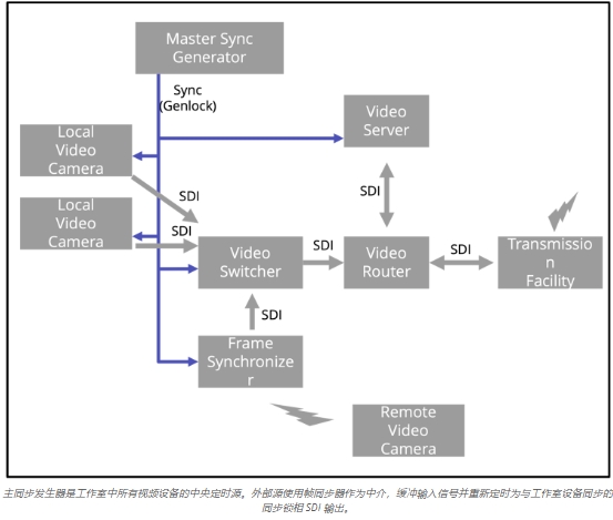 專業攝像機是工作室制作的核心,其性能依賴于精確的同步。以下是同步在典型攝像機設置中的級聯方式: