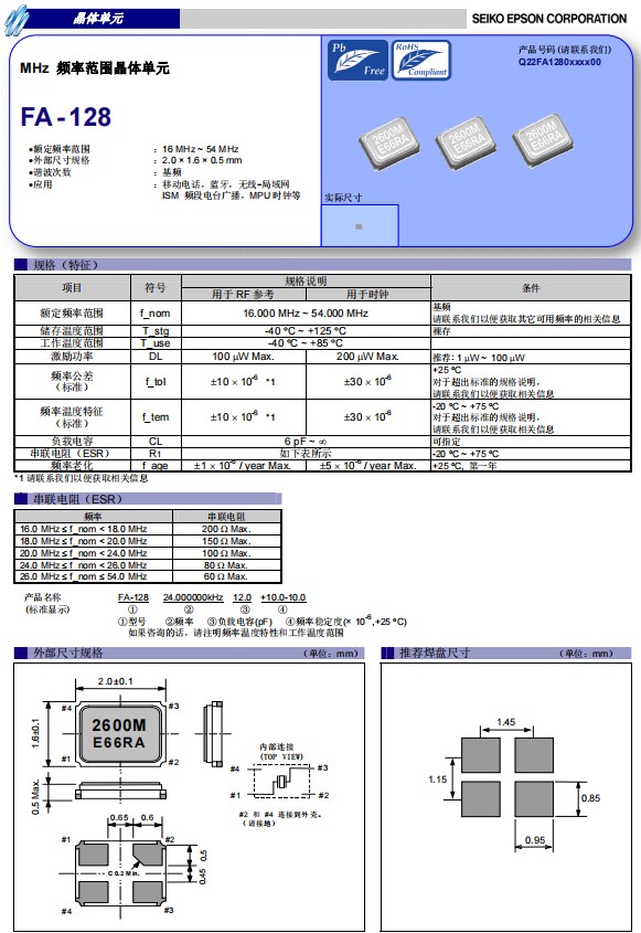 日本愛普生晶振FA-128,小體積尺寸2.0x1.6mm無源晶振,石英晶體諧振器,具有超小型,輕薄型,耐熱及耐環境特性,特別適用于有小型化要求的市場領域應用,比如智能手機,無線藍牙,平板電腦,等電子數碼產品。