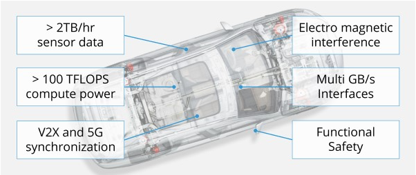 帶規(guī)格標注的半透明汽車:傳感器數(shù)據(jù)、計算能力、5G同步、EMI、接口、功能安全