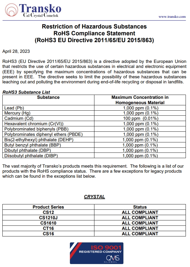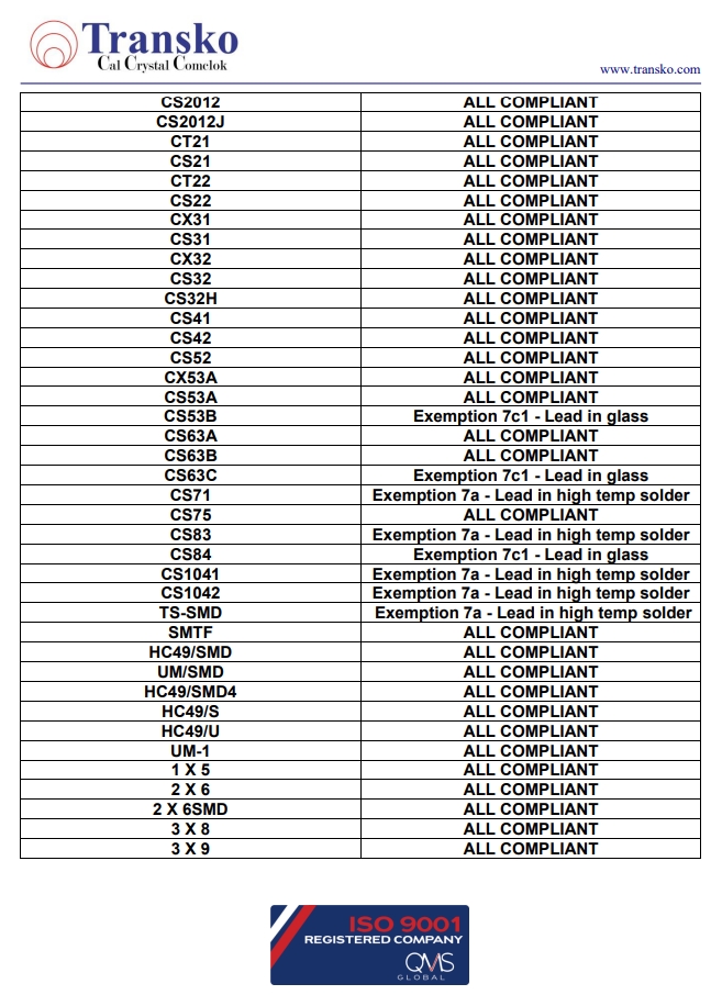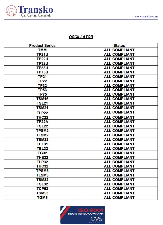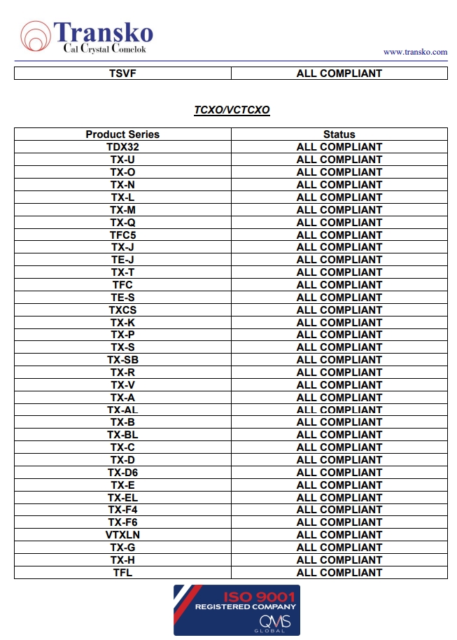 Transko Electronics, Inc.是一家領先的ISO 9001認證的電子行業頻率控制產品制造商,實施質量體系已滿足國家和國際質量體系的要求的需要。一直以來,Transko晶振的質量體系都持續符合ISO 9001的要求并不斷提高質量管理體系的有效性。提供優質的產品和服務是Transko Electronics, Inc.的既定政策,始終如一地滿足客戶的需求,實現了領先同行的高質量環保生產標準。
