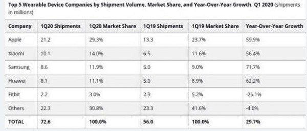 據外媒報道,市場研究機構IDC日前發布全球可穿戴設備季度跟蹤報告的最新數據,顯示全球可穿戴設備出貨量在2020年第一季度達到7260萬部,同比增長29.7%.其中,蘋果仍然遙遙領先,可穿戴設備獨占近三成市場份額.