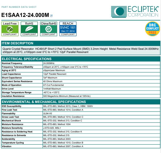 | EA5070PA24-6.000M | AT-Cut Fundamental | SMD Ceramic 5.0mm x 7.0mm | ±15ppm | -20°C to +70°C | ±3ppm | 7pF Maximum |