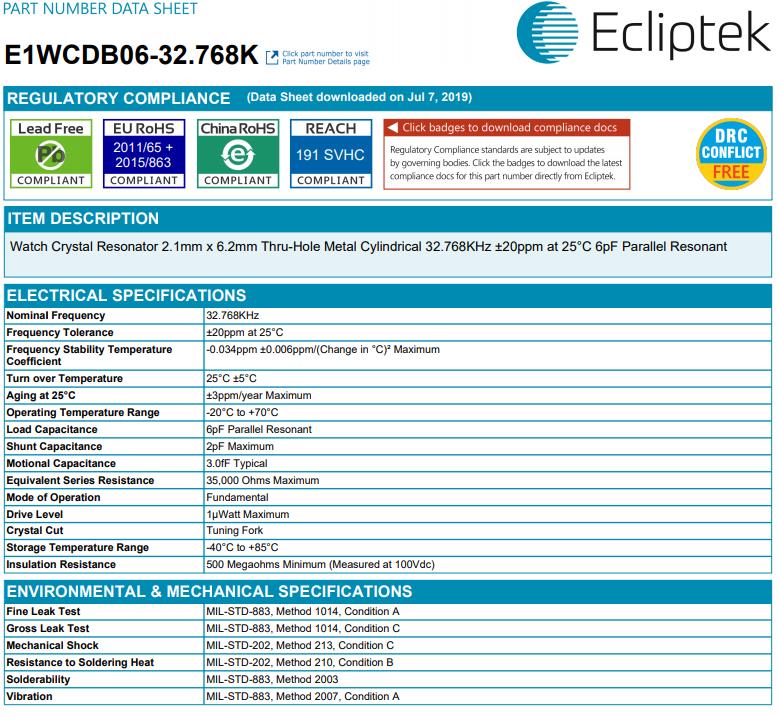 日蝕晶振E1WC,E1WCDB06-32.768K石英插件晶振, Ecliptek晶振,歐美晶振,石英晶體,音叉晶體,無源晶振,圓柱晶振,32.768K晶振型號E1WC,E1WCDB06-32.768K是一款圓柱型金屬面的插件晶振,尺寸為2060mm,頻率32.768KHZ,精度20ppm,負(fù)載電容10pF,工作溫度-20~+70°C.具備高性能的特點(diǎn),比較適合用于兒童玩具,錄音筆等領(lǐng)域.