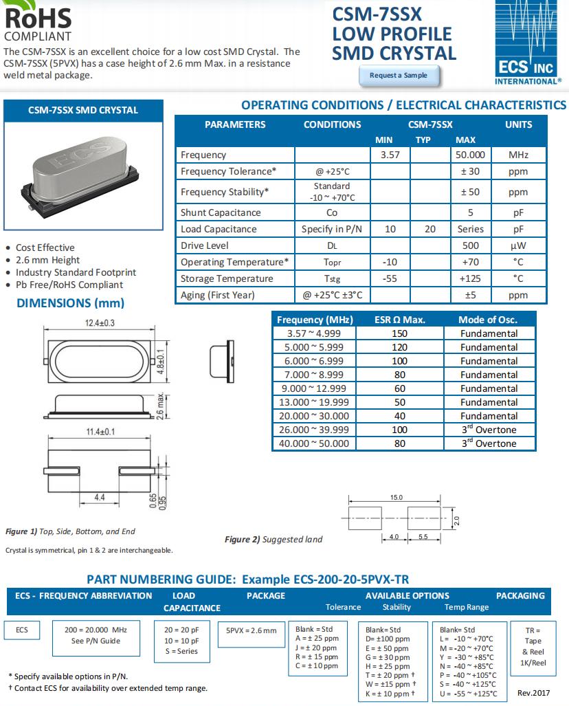 | ECS-40-20-5PVX | ECS晶振 | CSM-7SSX | 4MHz | -10°C ~ 70°C |