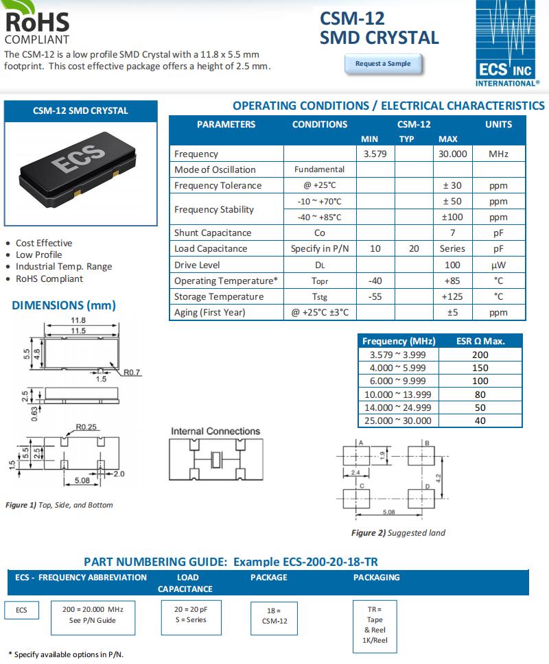 ECS-200-20-18-TR,CSM-12,ECS進口晶振,20MHz石英晶體,無鉛環保晶振,規格表