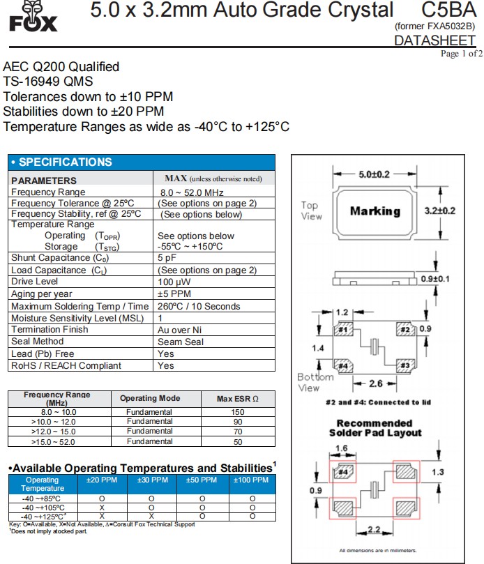 | FC5BACBEI13.0-T1 | Fox 晶振 | C5BA | 13 MHz | ±50ppm | ±30ppm | 10pF | -40°C ~ 125°C |