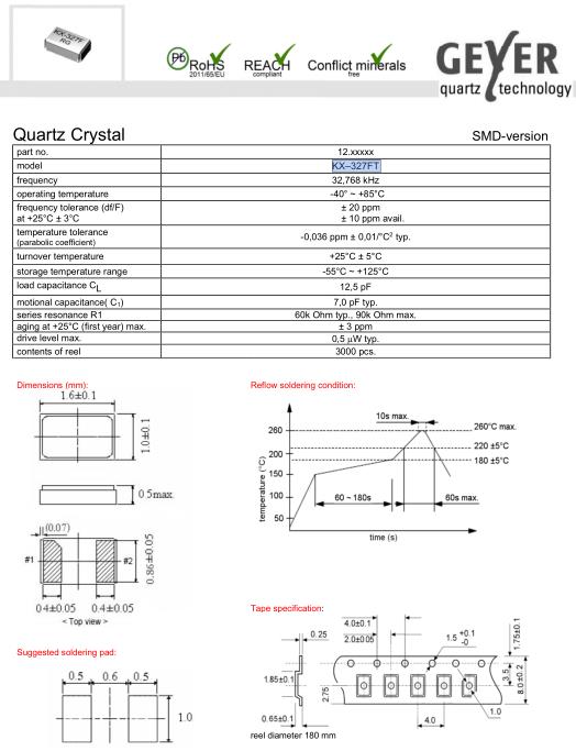 GEYER晶振,KX–327FT無源晶體,32.768K晶振,貼片表晶32.768K系列千赫晶體KHZ具有超小型,薄型,質(zhì)地輕的表面貼片音叉型石英晶體振蕩器,晶振產(chǎn)品本身具備優(yōu)良的耐熱性,耐環(huán)境特性,在辦公自動(dòng)化,家電領(lǐng)域,移動(dòng)通信領(lǐng)域可發(fā)揮優(yōu)良的電氣特性,符合無鉛標(biāo)準(zhǔn),滿足無鉛焊接的回流溫度曲線要求,金屬外殼的石英晶振使得產(chǎn)品在封裝時(shí)能發(fā)揮比陶瓷晶振外殼更好的耐沖擊性能.