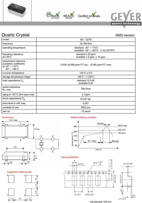 GEYER格耶晶振,KX-327S無源晶體,8038mm貼片晶振,32.768KHZ晶振時鐘晶體具有小型,薄型,輕型的貼片晶振表面音叉型晶體振蕩器,產品具有優良的耐熱性,耐環境特性,可發揮晶振優良的電氣特性,符合RoHS規定,滿足無鉛焊接的高溫回流溫度曲線要求,金屬外殼的封裝使得產品在封裝時能發揮比陶瓷振蕩器外殼更好的耐沖擊性.