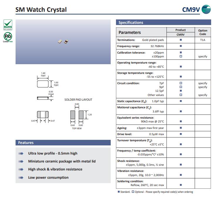 高利奇晶振,CM9V-T1A晶振,32.768K系列晶振此款SMD晶體并且可以承受回流焊接的高溫,波峰焊接,回流焊接等,貼片表晶主要特點(diǎn)是該產(chǎn)品排帶包裝,焊接模式主要使用SMT焊接,給現(xiàn)代SMT工藝帶來(lái)高速的工作效率,32.768K系列產(chǎn)品本身具有體積小,厚度薄,重量輕等特點(diǎn),此音叉型石英晶體諧振器,晶振產(chǎn)品本身具備優(yōu)良的耐熱性,耐環(huán)境特性,在辦公自動(dòng)化,家電領(lǐng)域,移動(dòng)通信領(lǐng)域可發(fā)揮優(yōu)良的電氣特性,符合無(wú)鉛標(biāo)準(zhǔn),滿足無(wú)鉛焊接的回流溫度曲線要求,金屬外殼的石英晶振使得產(chǎn)品在封裝時(shí)能發(fā)揮比陶瓷晶振外殼更好的耐沖擊性能.