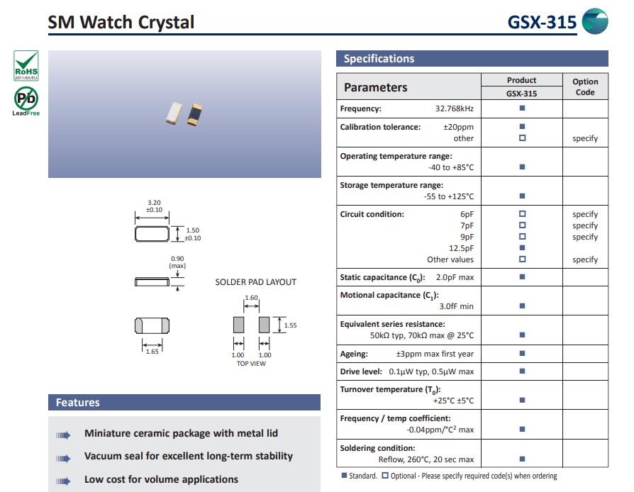 Golledge晶振,GSX-315晶振,3215無源晶振小體積SMD時鐘晶體諧振器,是貼片音叉晶體,千赫頻率元件,應用于時鐘模塊,智能手機,全球定位系統,因產品本身體積小,SMD編帶型,可應用于高性能自動貼片焊接,被廣泛應用到各種小巧的便攜式消費電子數碼時間產品,環保性能符合ROHS/無鉛標準.