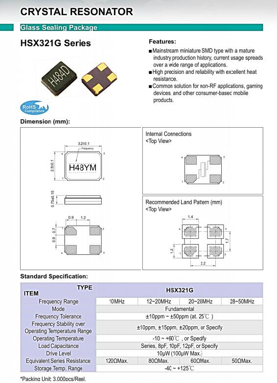 加高晶振,HSX321G晶振,3225四腳晶振3225mm體積非常小的SMDcrystal器件,"X3GO27000BA1H-HU"是民用小型無線數碼產品的最佳選擇,小體積的晶振被廣泛應用到,手機藍牙,GPS定位系統,無線通訊集,高精度和高頻率的穩定性能,非常好的減少電磁干擾的影響,是民用無線數碼產品最好的選擇,符合RoHS/無鉛.