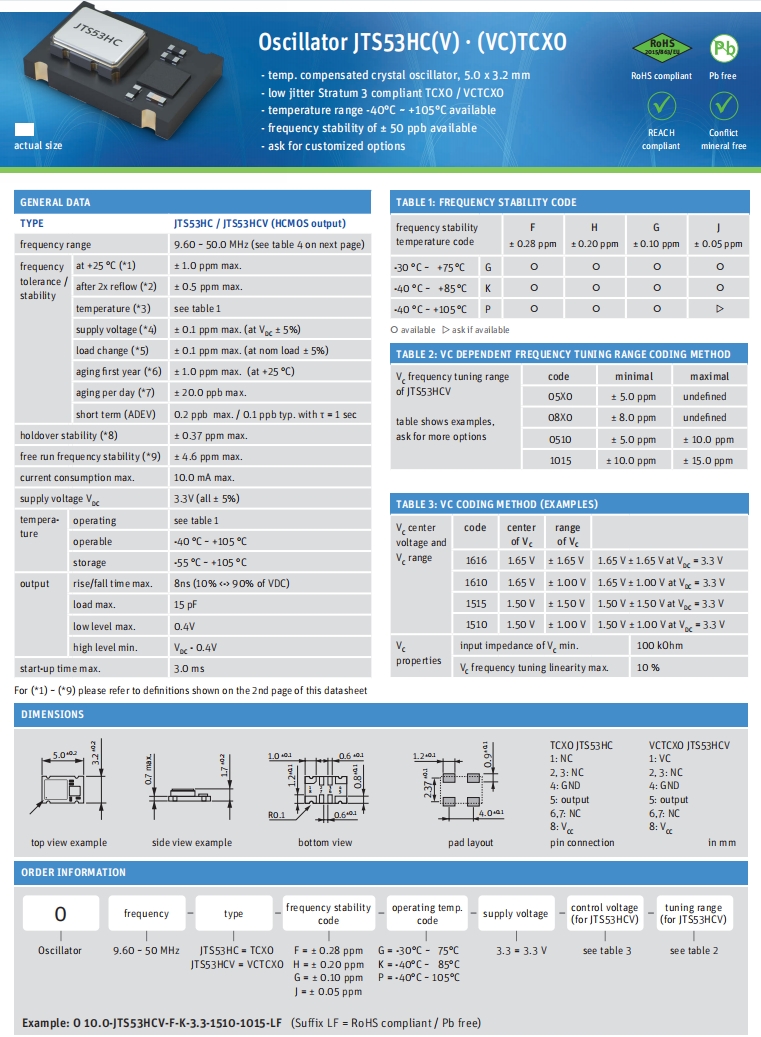 Jauch品牌,O 25.0-JTS53HCV-G-P-3.3-1510-1015-LF,6G路由器晶振規格表