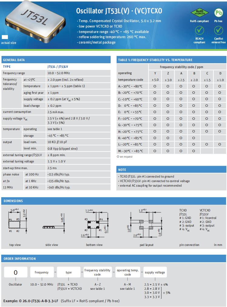 Jauch品牌,O 36.860-JT53LV-B-K-3.0-LF,6G室內路由器晶振規格表