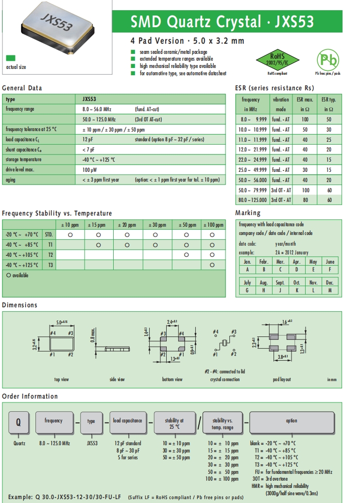 | Q 24.0-JXS22-12-10/10-FU-WA-LF | Jauch晶振 | JXS22-WA | 24MHz | ±10ppm | 12pF | -20°C ~ 70°C |