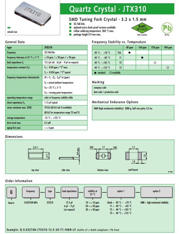 | Q 0.032768-JTX310-12.5-10-T3-HMR-LF | JTX310 | 32.768kHz | ±10ppm | 12.5pF |