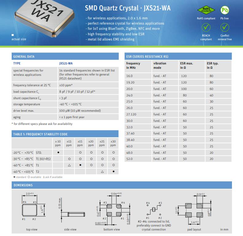 Jauch晶振,JXS21-WA晶振,2016小體積晶振是目前有源晶振中體積最小的一款,產品本身帶溫度補償作用的晶體振蕩器,該體積產品最適合于GPS,以及衛(wèi)星通訊系統(tǒng),智能電話等多用途的高穩(wěn)定的頻率溫度特性晶振.