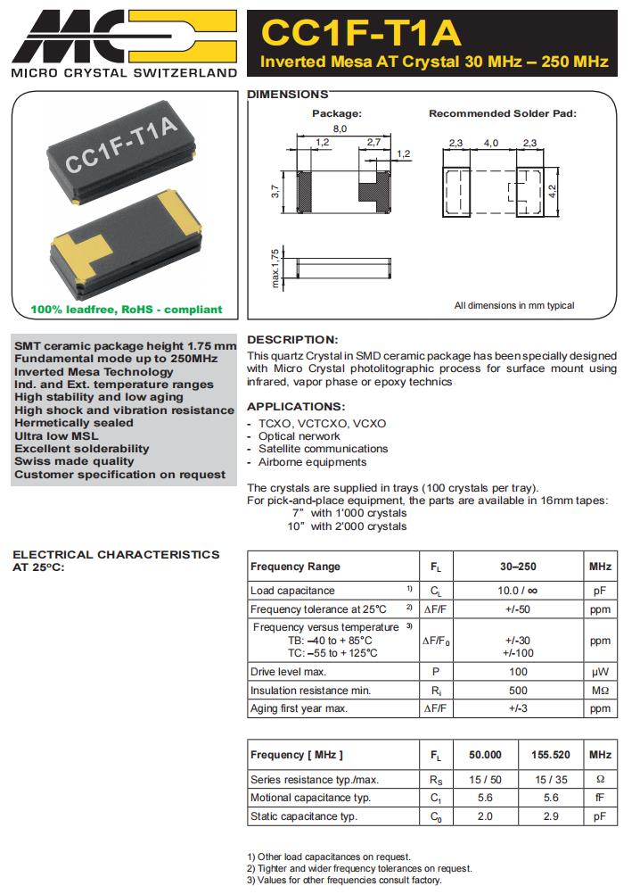 CC1F-T1A-106.250MHz-10.0pF-50ppm-TB-QI|耐高溫晶振|6G通信晶振,Micro石英晶振,CC1F-T1A無源晶振,CC1F-T1A-106.250MHz-10.0pF-50ppm-TB-QI晶振,8037mm貼片晶振,頻率106.25MHz,負(fù)載10pf,頻率穩(wěn)定性50ppm,工作溫度-40~125°C,耐高溫晶振,抗沖擊晶振,6G通信晶振,遙感勘測晶振,光學(xué)網(wǎng)絡(luò)晶振,機(jī)載設(shè)備晶振,保健和醫(yī)療設(shè)備晶振.