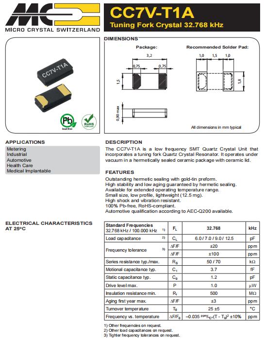 CC7V-T1A-32.768kHz-6pF-20ppm-TC-QA,6G無線網絡晶振,瑞士微晶晶振規格表