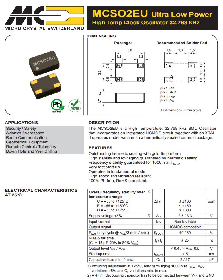 MCSO2EUV-D-32.768kHz-E/D-T3,5032mm晶振,6G基站晶振,Micro晶振,MCSO2EU石英晶體振蕩器,MCSO2EUV-D-32.768kHz-E/D-T3晶振,5032mm晶振,32.768K有源晶振,電壓3.3V,頻率穩定性100ppm,工作溫度-55~175°C,抗沖擊晶振,抗振動晶振,6G基站晶振,安全設備晶振,航空航天應用晶振,地熱設備晶振,井下和鉆井應用晶振,遠程控制應用晶振.