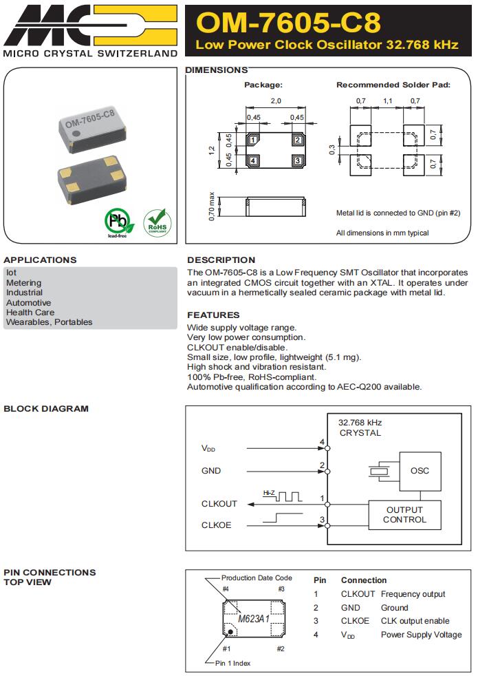 | OM-7604-C7-32.768kHz-20PPM-TB-QC | Micro Crystal | 標準時鐘振蕩器 32.768 kHz +/-20 PPM -40/+125C |