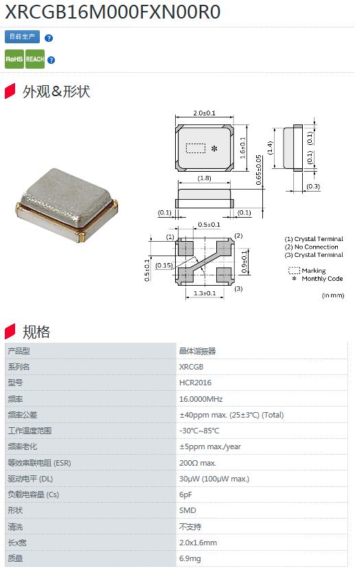 日本村田晶振,XRCGB系列晶振,HCR2016型號晶振,XRCGB16M000FXN00R0晶振