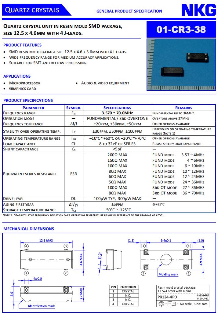 NKG晶振|01-CR3-38-24M576-T30-3050E-EXT|進(jìn)口陶瓷晶振,NKG晶振,香港進(jìn)口晶振,01-CR3-38無(wú)源晶振,陶瓷晶振,01-CR3-38-24M576-T30-3050E-EXT晶振,石英晶體諧振器,12.5 x 4.6 mm晶振,四腳貼片晶振,SMD晶振,頻率24.576MHz,負(fù)載30pF,工作溫度-20~70°C,頻率容差30pm,無(wú)鉛環(huán)保晶振,高穩(wěn)定性晶振,低老化晶振,微處理器晶振,顯卡晶振,影音設(shè)備晶振,專業(yè)視頻設(shè)備晶振.