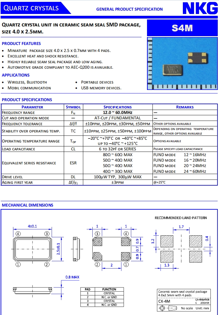 NKG Crystal|S4M52.000F20E2Z-EXT|6G移動通信晶振規格表