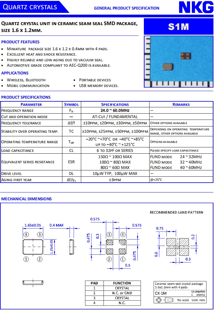 NKG晶振|S1M25.000F18E23-EXT|1612mm超小型晶振規格表