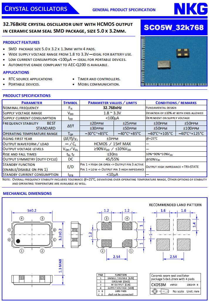 NKG晶振|SCO5W-B-32K768-ZTS-EXT|5032有源晶振,NKG晶振,SCO5W有源晶振,SPXO晶體振蕩器,SCO5W-B-32K768-ZTS-EXT晶振,千赫晶體KHZ,5032mm晶振,SMD晶體,四腳貼片晶振,頻率32.768KHz,電壓3.3V,負載15pF,工作溫度-40~125°C,頻率穩定性50ppm,高可靠性晶振,耐高溫晶振,低功耗晶振,全球定位系統晶振,汽車控制模塊晶振,環繞視圖攝像頭晶振,信息娛樂系統晶振.