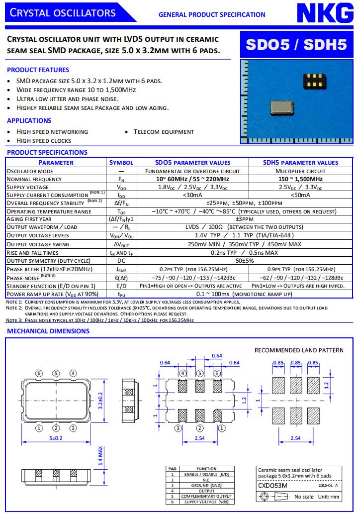 NKG進口晶振|SDO5-6-A-150.00-WTS-EXT|5032差分晶振特點