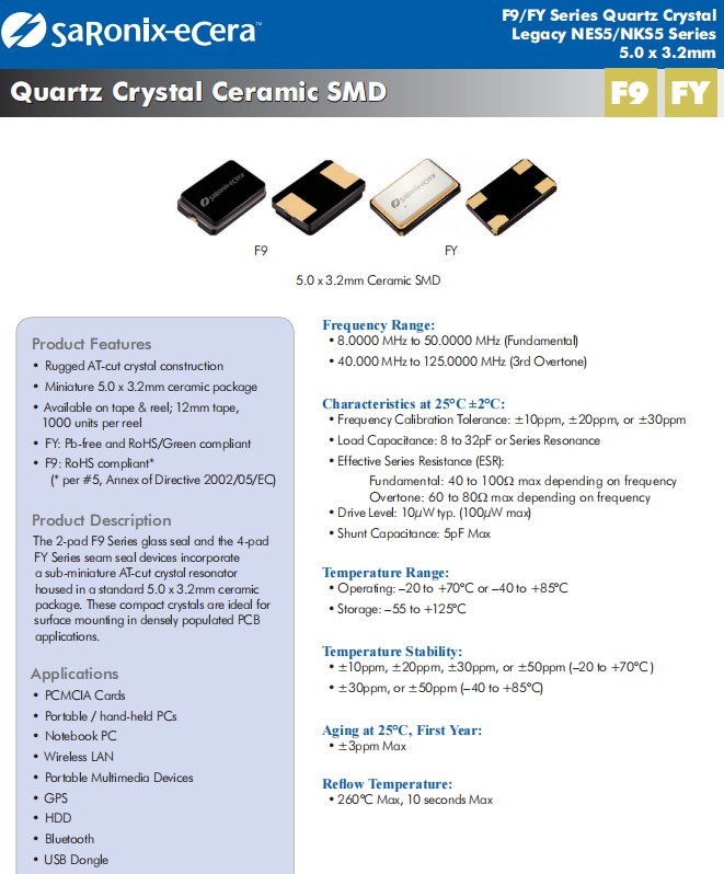 | F92500042 | Diodes晶振 | F9 | 25MHz | ±50ppm | ±20ppm | 18pF | -20°C ~ 70°C |