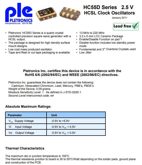 Pletronics晶振,HC55D晶振,HCSL輸出晶振