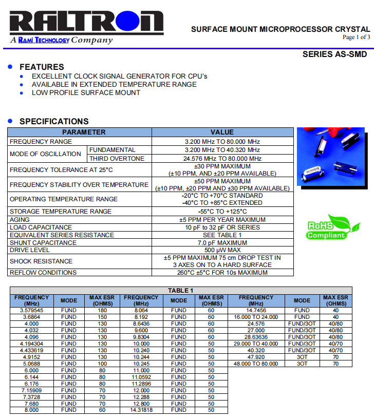 | AS-9.8304-18-SMD-TR | AS-SMD | 9.8304MHz | 13.50 x 4.80mm | ± 30 ppm | ± 50 ppm | 18 pF | -20°C~+70°C |