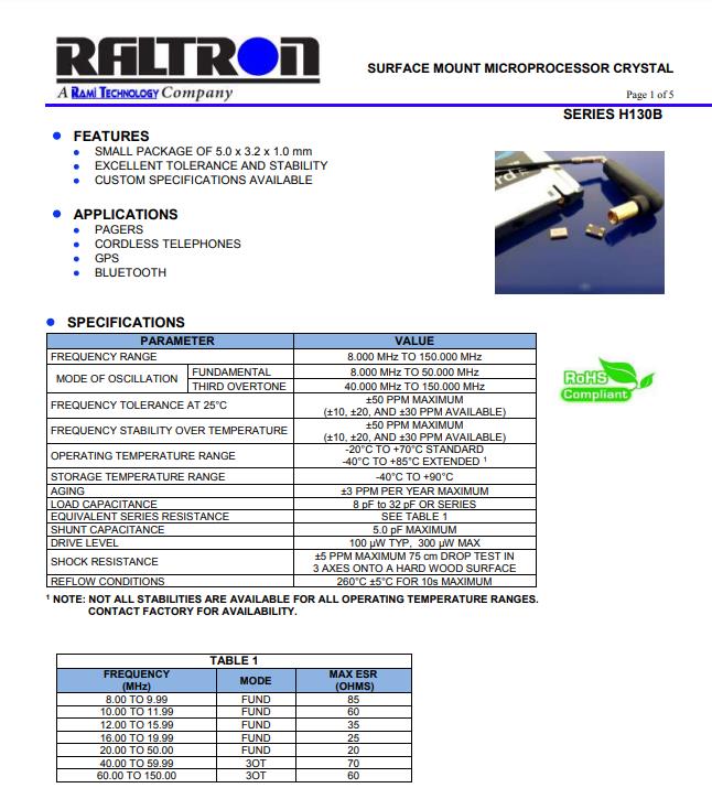 | Raltron原廠編碼 | 型號 | 頻率 | 尺寸 | 頻率偏差 | 頻率穩定度 | 負載 | 工作溫度 |