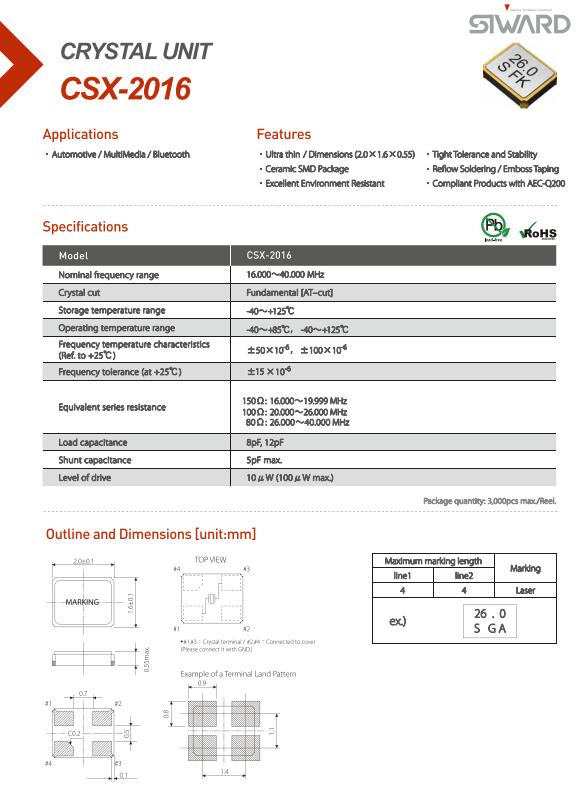 臺灣希華晶振,CSX-2016晶振,2016小體積晶振,外觀尺寸具有薄型表面貼片型石英晶體諧振器,特別適用于有小型化要求的市場領域,比如智能手機,無線藍牙,平板電腦等電子數碼產品.晶振本身超小型,薄型,重量輕,晶體具有優良的耐環境特性,如耐熱性,耐沖擊性,在辦公自動化,家電相關電器領域及Bluetooth,Wireless LAN等短距離無線通信領域可發揮優良的電氣特性,滿足無鉛焊接的回流溫度曲線要求.