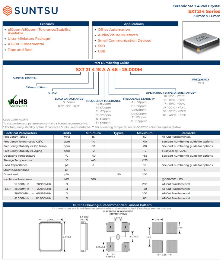 | SXT21410AA16-48.000M | 2.0X1.6 SMD (4 PAD) CRYSTAL | 10pF | ±50ppm | 48.000M |
