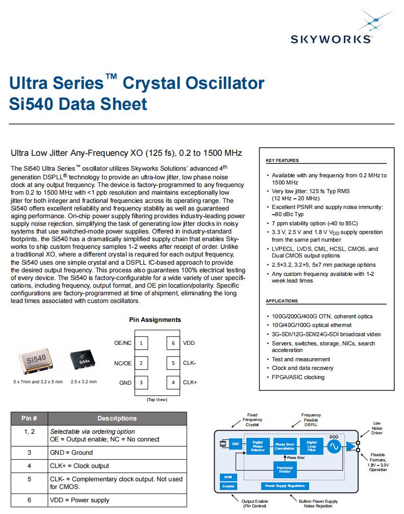 | 540BBA100M000ABG | Skyworks Solutions Inc. | Ultra™ Si540 | 100 MHz | LVDS | 1.8V, 2.5V, 3.3V | ±10ppm |