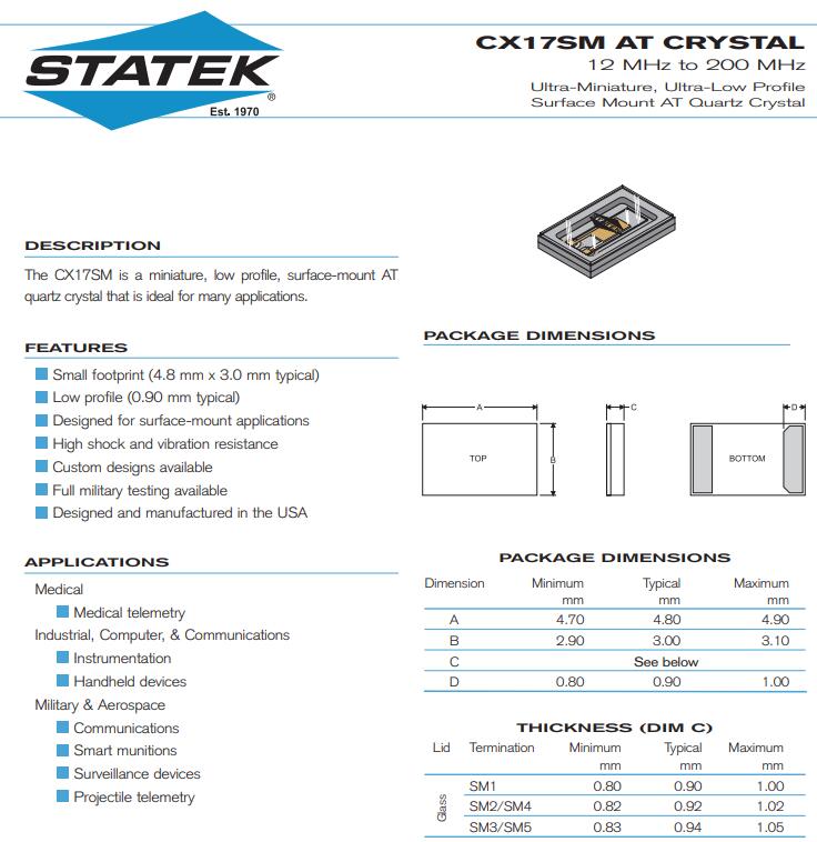 美國STATEK晶振,CX17SM晶振,二腳晶體諧振器貼片晶振本身體積小,超薄型石英晶體諧振器,特別適用于有目前高速發展的高端電子數碼產品,因為晶振本身小型化需求的市場領域,小型?薄型是對應陶瓷諧振器(偏差大)和普通的石英晶體諧振器(偏差?。┑闹虚g領域的一種性價比較出色的產品.產品廣泛用于筆記本電腦,無線電話,衛星導航HDD, SSD, USB, Blu-ray等用途,符合無鉛焊接的高溫回流焊曲線特性.