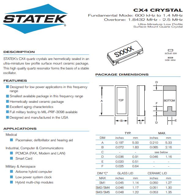 STATEK晶振,CX4晶振,5020小體積晶振外觀尺寸具有薄型表面貼片型石英晶體諧振器,特別適用于有小型化要求的市場領域,比如智能手機,無線藍牙,平板電腦等電子數碼產品.晶振本身超小型,薄型,重量輕,晶體具有優良的耐環境特性,如耐熱性,耐沖擊性,在辦公自動化,家電相關電器領域及Bluetooth,Wireless LAN等短距離無線通信領域可發揮優良的電氣特性,滿足無鉛焊接的回流溫度曲線要求.