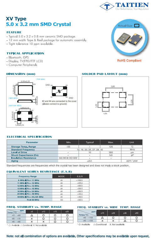 XVHCELNANF-8.000000-8MHz-30PPM-5032--40~85℃-TAITIEN,臺灣進口石英晶振,典型的5.0 x 3.2 x 0.8 mm陶瓷SMD封裝。- 12 mm寬的膠帶和卷軸包裝,用于自動組裝。-緊密公差10 ppm可用,藍牙、GPS顯示器、電視(FPD/FTF LCD),計算機外圍設備