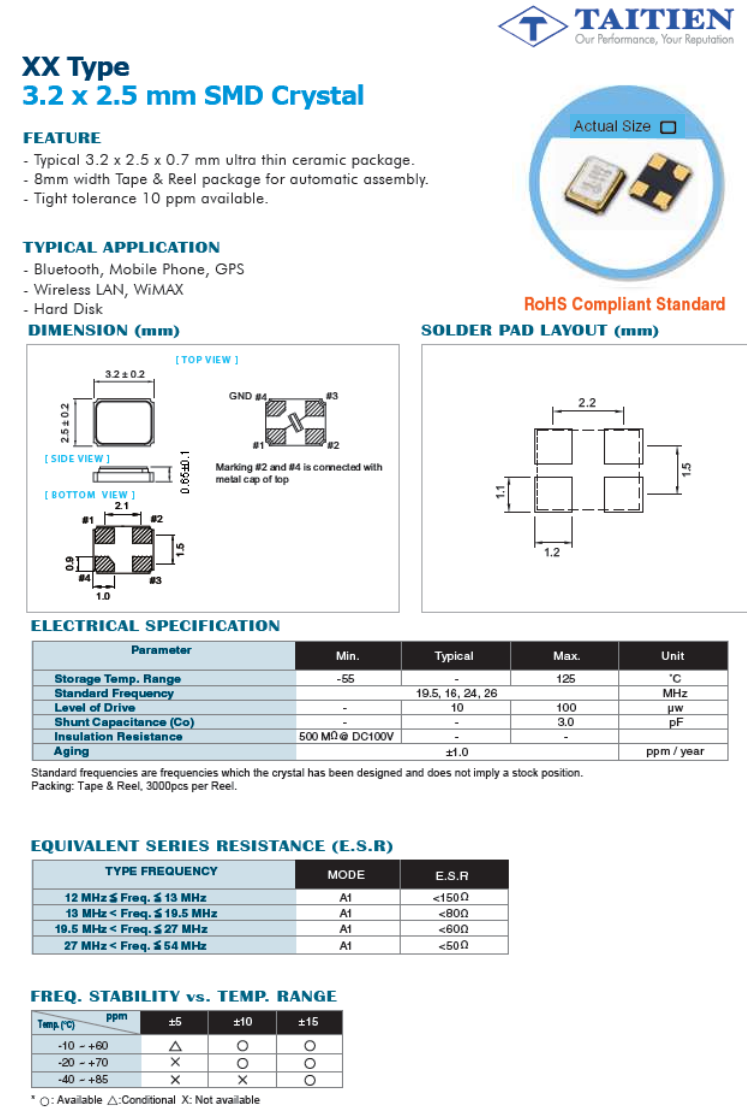 | TAITIEN原廠編碼 | 生產廠家 | 型號 | 頻率 | 頻率穩定度 | 頻率偏差 | 負載電容 |